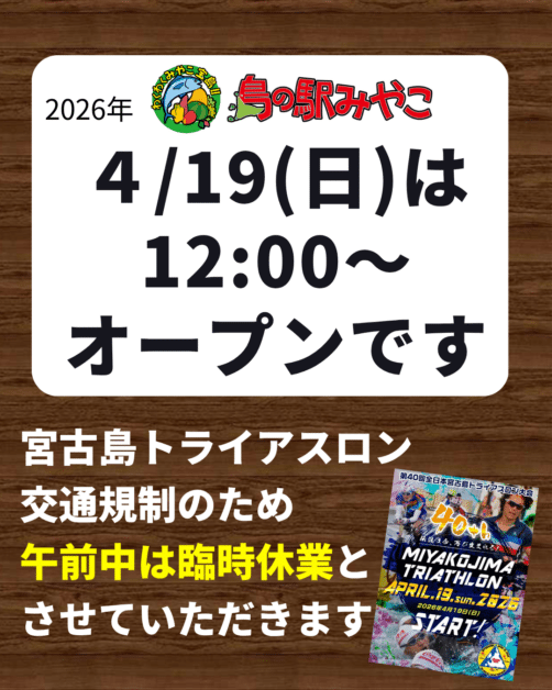Due to traffic restrictions for the Miyakojima Triathlon on April 19, 2026, Shima-no-Eki Miyako will open at 12:00 PM.